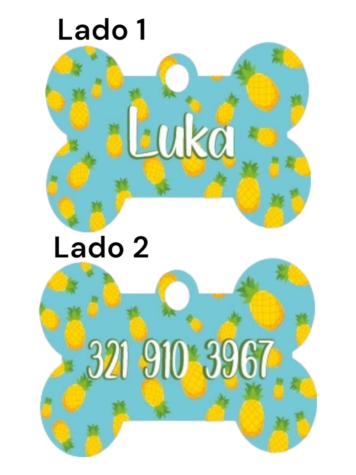 - Doble cara estampada: Nombre de la mascota por uno de los lados y número telefónico al reverso.